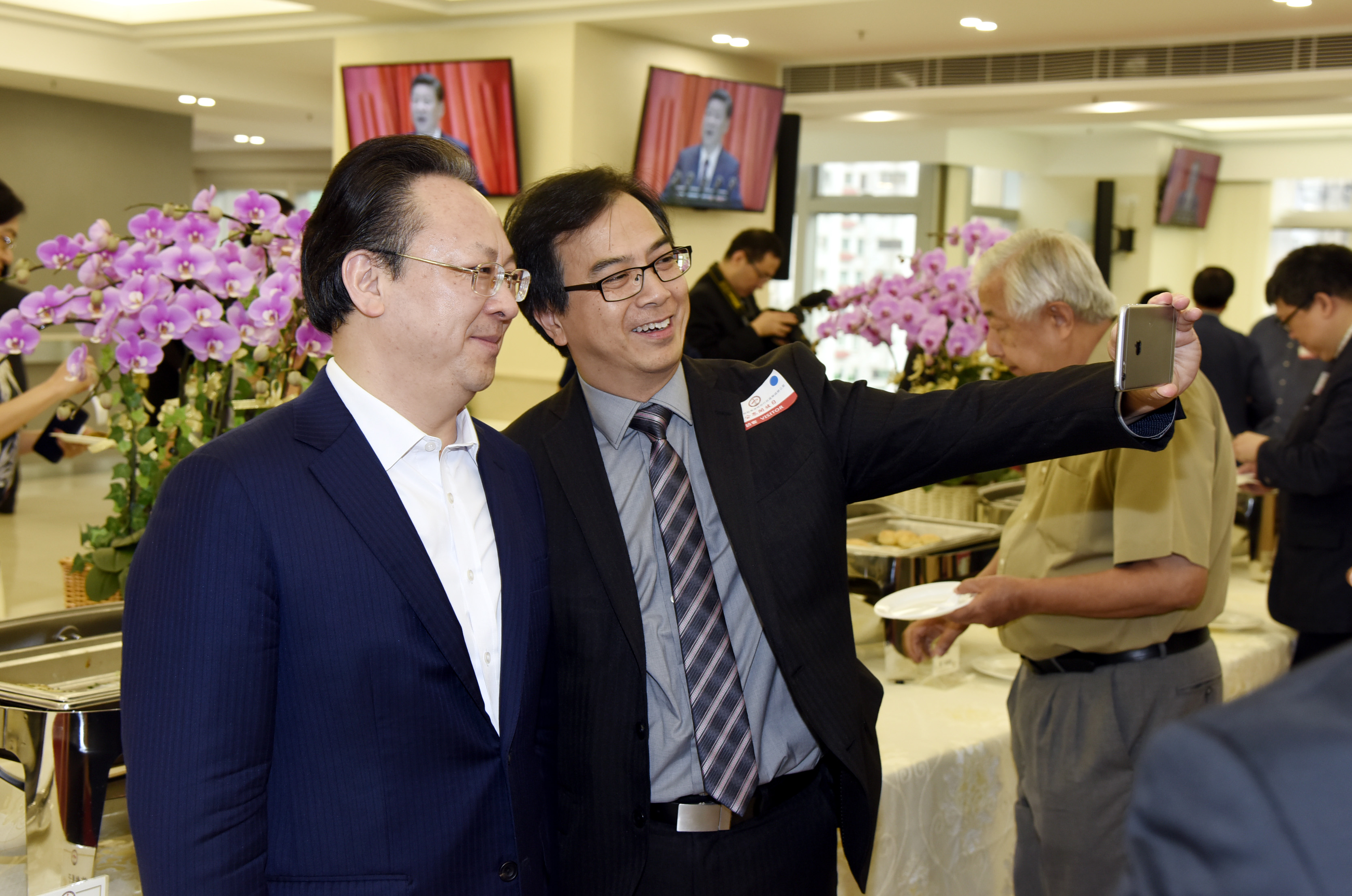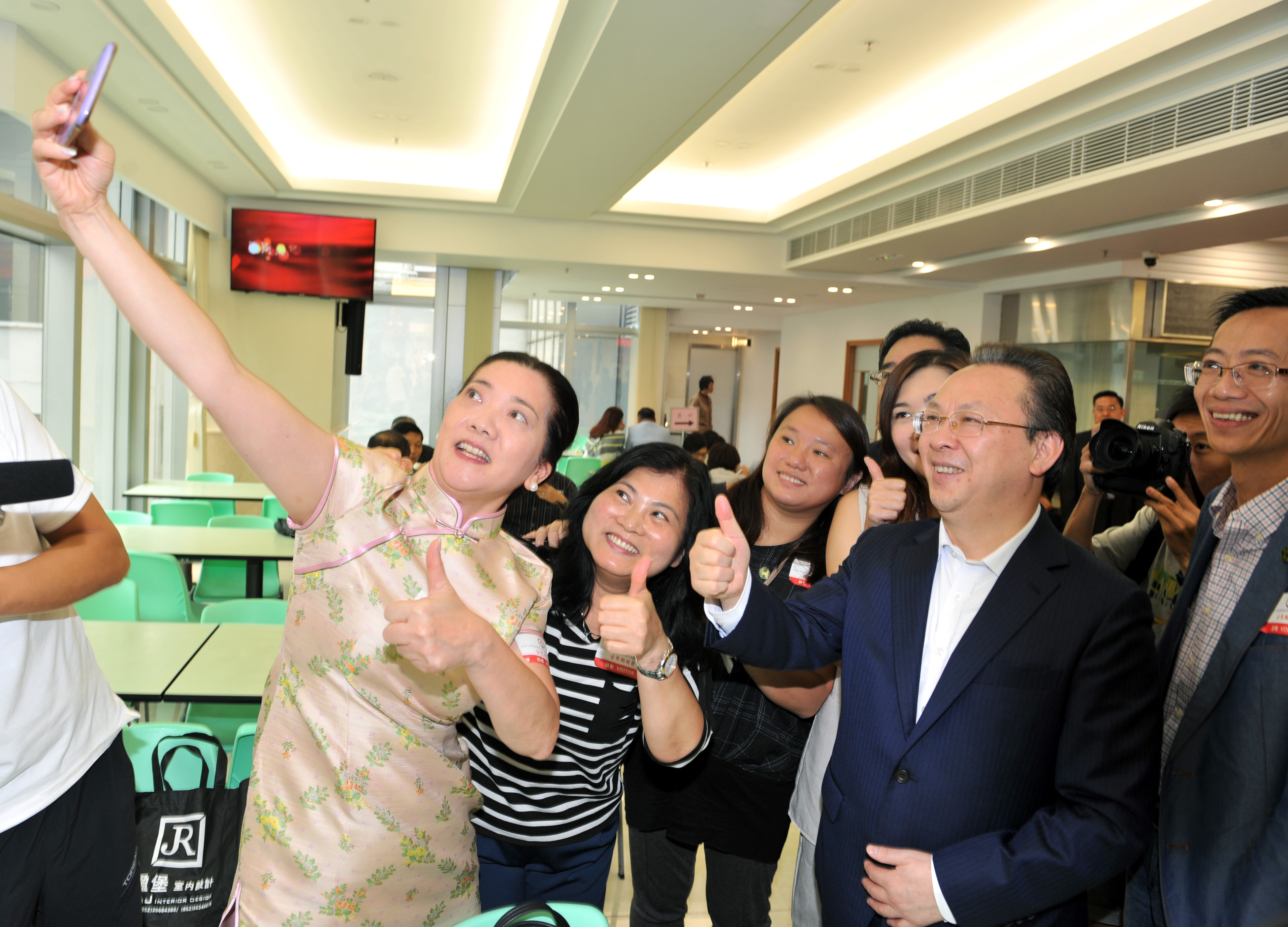 來賓在8樓員工餐廳與譚鐵牛副主任自拍留影。(圖片來源:中央政府駐港聯絡辦)