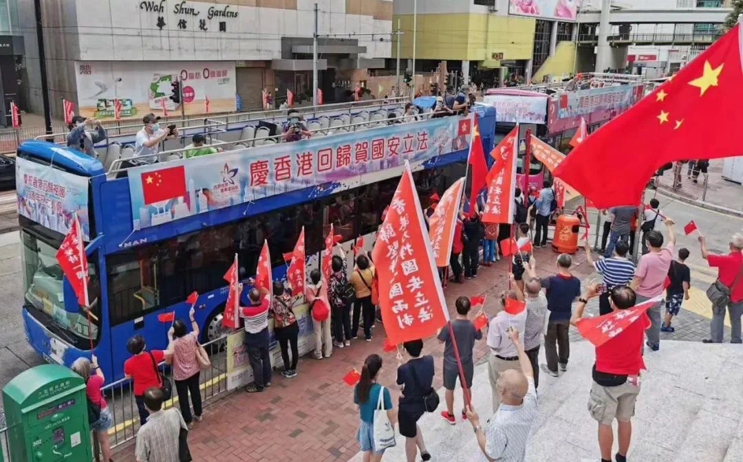 7月1日,超過100艘懸挂國旗、區旗及「賀國安立法」主題橫幅的漁船,由香港仔出發巡游至中環碼頭。巴士花車和的士也在全港巡游。