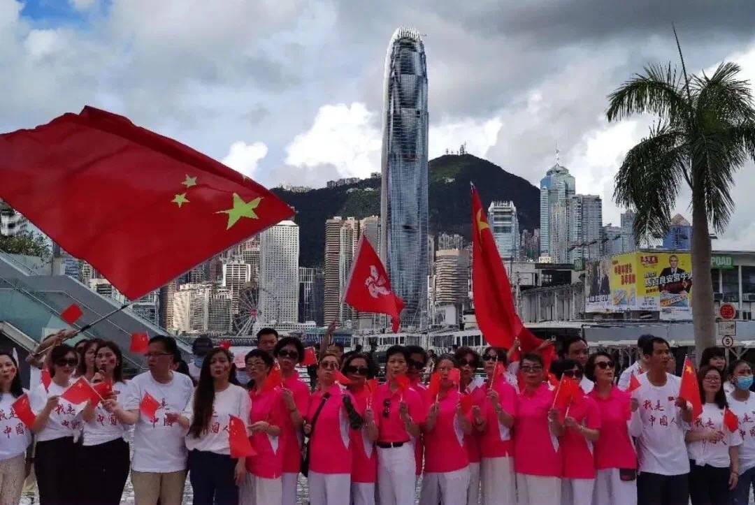 7月1日,香港市民在山頂廣場、天壇大佛廣場、中環摩天輪等多個地標高唱國歌,表達慶祝香港回歸,支持國安立法的共同心聲。