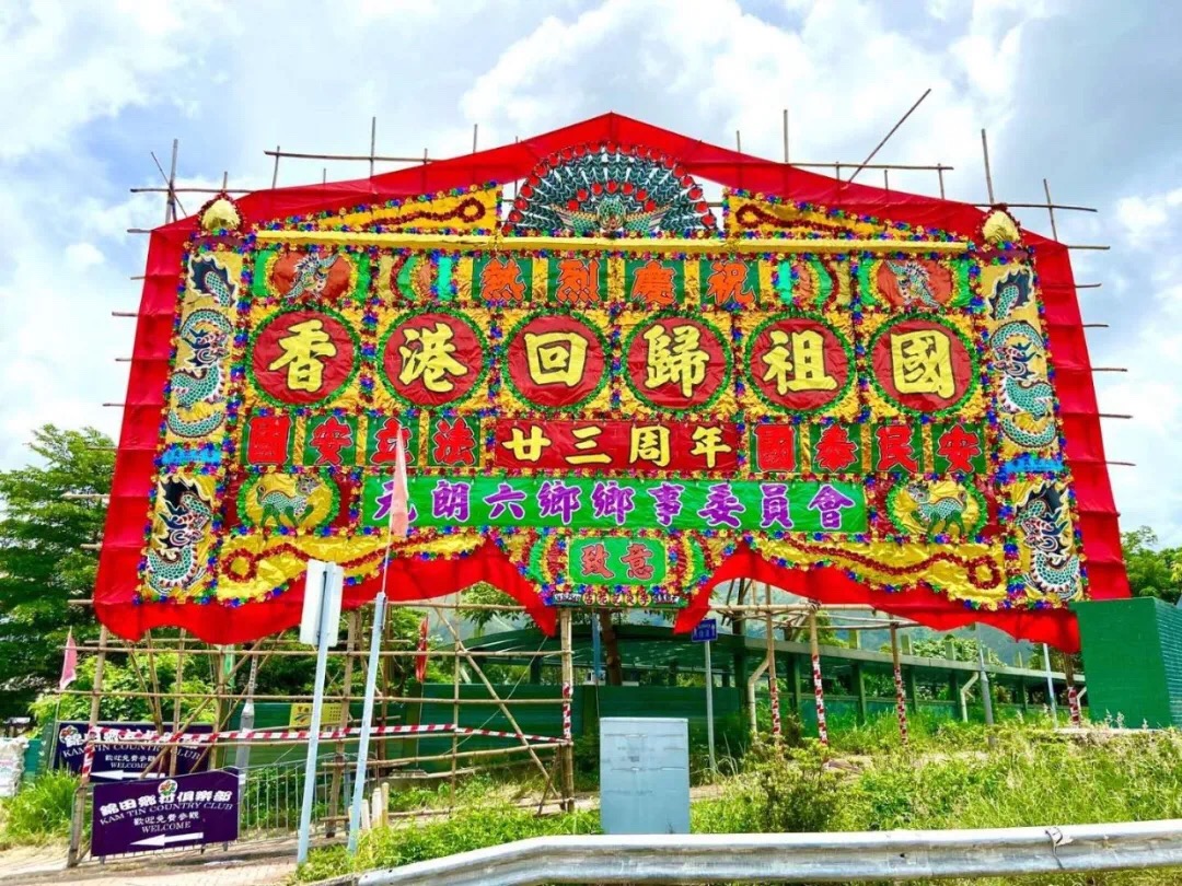 7月1日,香港新界大埔、沙田、元朗、荃灣等地區鄉民,紛紛在交通交匯處以及醒目顯眼位置,以香港獨特的傳統手工藝,高高展示富有新界傳統特色的巨型絢麗花牌,向祖國、向香港表達美好的祝福。