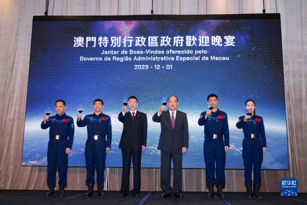 12月1日,澳門特區行政長官賀一誠(右三)、中國載人航天工程辦公室副主任、代表團團長林西強(左三)和代表團成員在歡迎晚宴上祝酒。新華社記者 張金加 攝